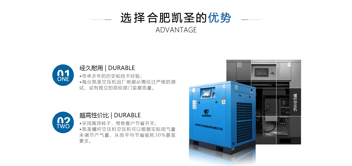 合肥凱圣節能科技有限公司是從事永磁變頻螺桿壓縮機系統的設計、制造、安裝、調試、維修與一體的公司。 在多年的螺桿空壓機研發與推廣歷程里,凱圣聚集和培養了大量壓縮機技術設計和管理人員,迅速發展成為集研究、生產、銷售、服務等環節為一體、嚴格按照標準執行的企業,公司成立開始,即以滿足客戶的實際需求為己任,大力開拓國內外節能型空壓機市場,并始終保持創新精神,全力研發更為節能的螺桿式空壓機,努力站在空壓機節能領域的排頭位置。 應用范圍:公司產品廣泛應用于機械、輕工、紡織、食品、石油、化工、冶金、礦山、電力、城建、醫學研究和科研等各行業中,將為節約能源做出巨大貢獻。公司秉承“信譽至上,...